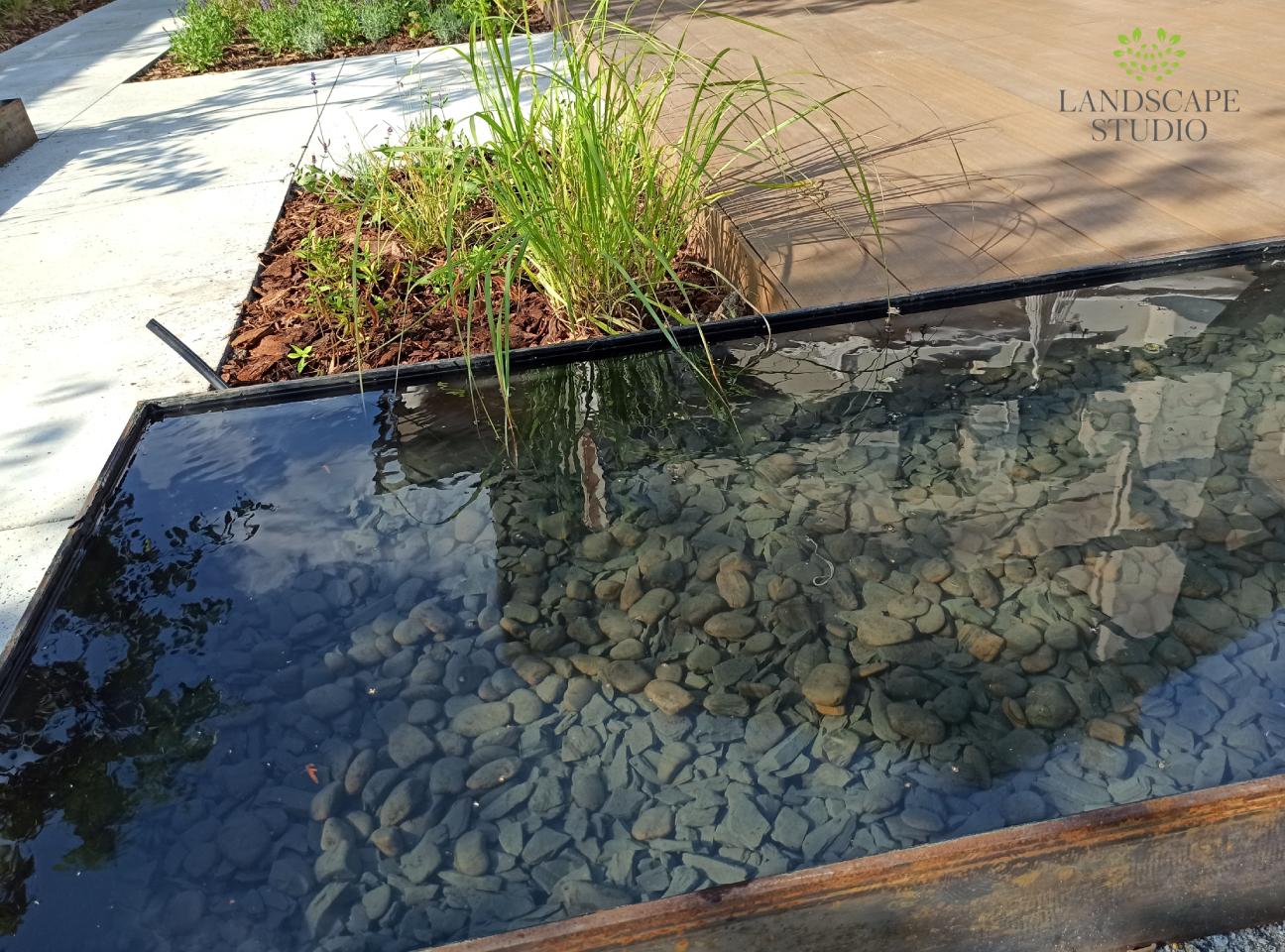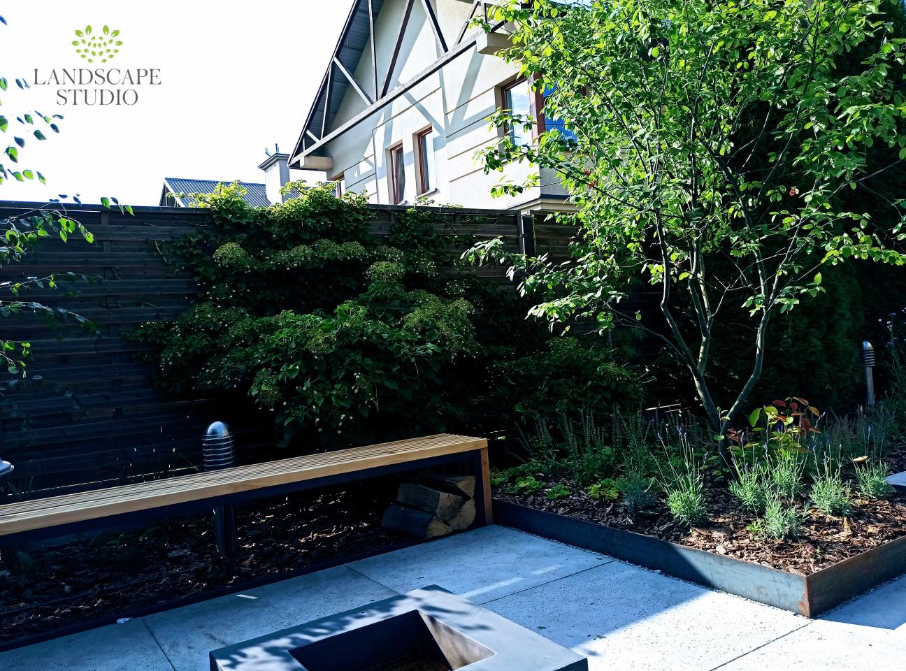 Z niewielkiej nieuporządkowanej przestrzeni stworzyliśmy strefę wypoczynku. Powstał taras z deski kompozytowej, nawierzchnia z płyt, system nawadniania i nowoczesne oświetlenie. Podwyższone rabaty i drewniane siedziska nadały trójwymiarowości. Całość dopełnia stalowy zbiornik wodny oraz dekoracyjne panele roślinnymi motywami.