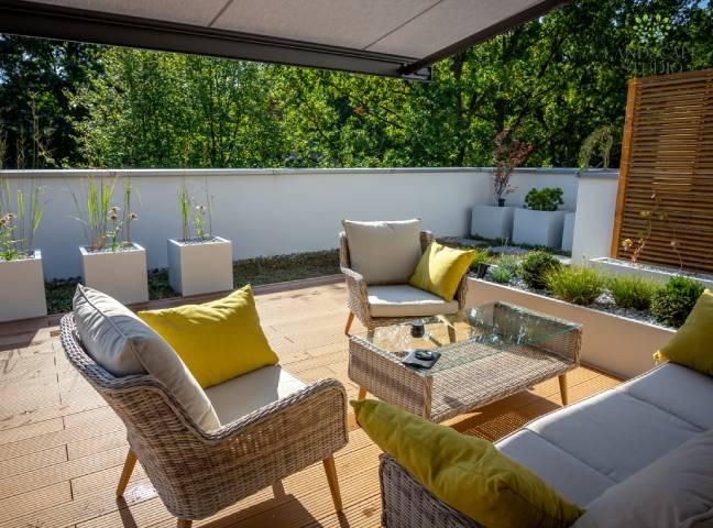Z pustego dachu powstała zielona oaza. W ciągu dwóch tygodni położyliśmy betonowe płyty tarasowe i maty rozchodnikowe. Poszerzona została przestrzeń tarasowa z deski kompozytowej. Ustawiliśmy donice z nasadzeniami krzewów, kwitnących bylin oraz ozdobnych traw. Zamontowaliśmy kratki dla pnączy i stworzyliśmy wygodną strefę relaksu.